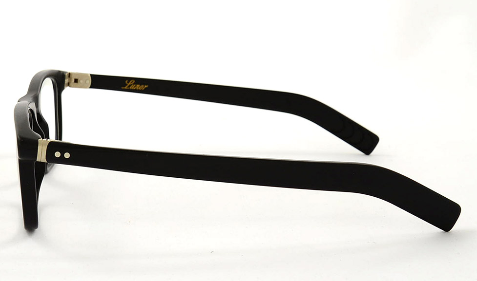Eckig und doch harmonisch, schwarz matt und doch keineswegs langweilig: Das zeichnet die Lunor A6 Mod 250 in matt schwarz aus. Die Kunststoff-Brille eignet sich für Damen und Herren, verstärkt dezente Gesichtszüge und fügt sich in ein markantes Gesicht sehenswert ein. Ein Hingucker ist der vergoldete Ring am Übergang zum Brillenbügel, der sich dann wieder schmal und elegant an die Kopfform anpasst.